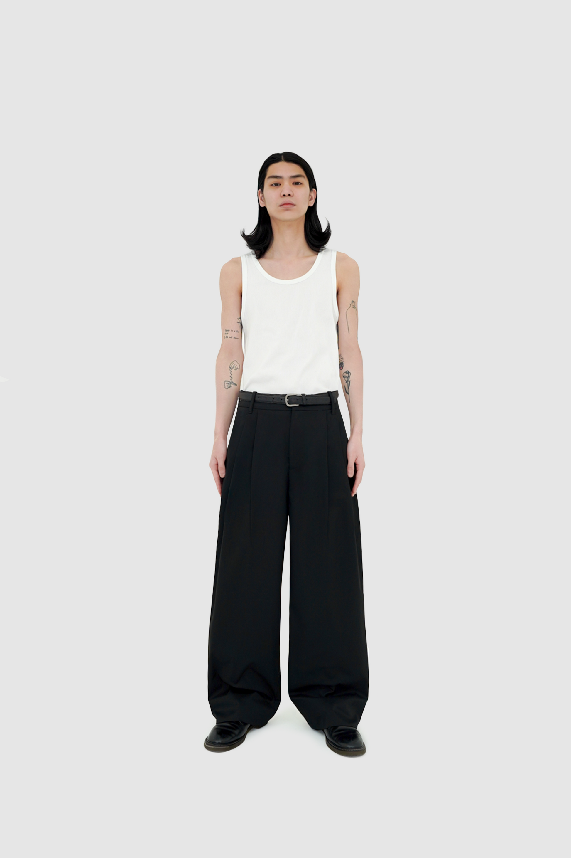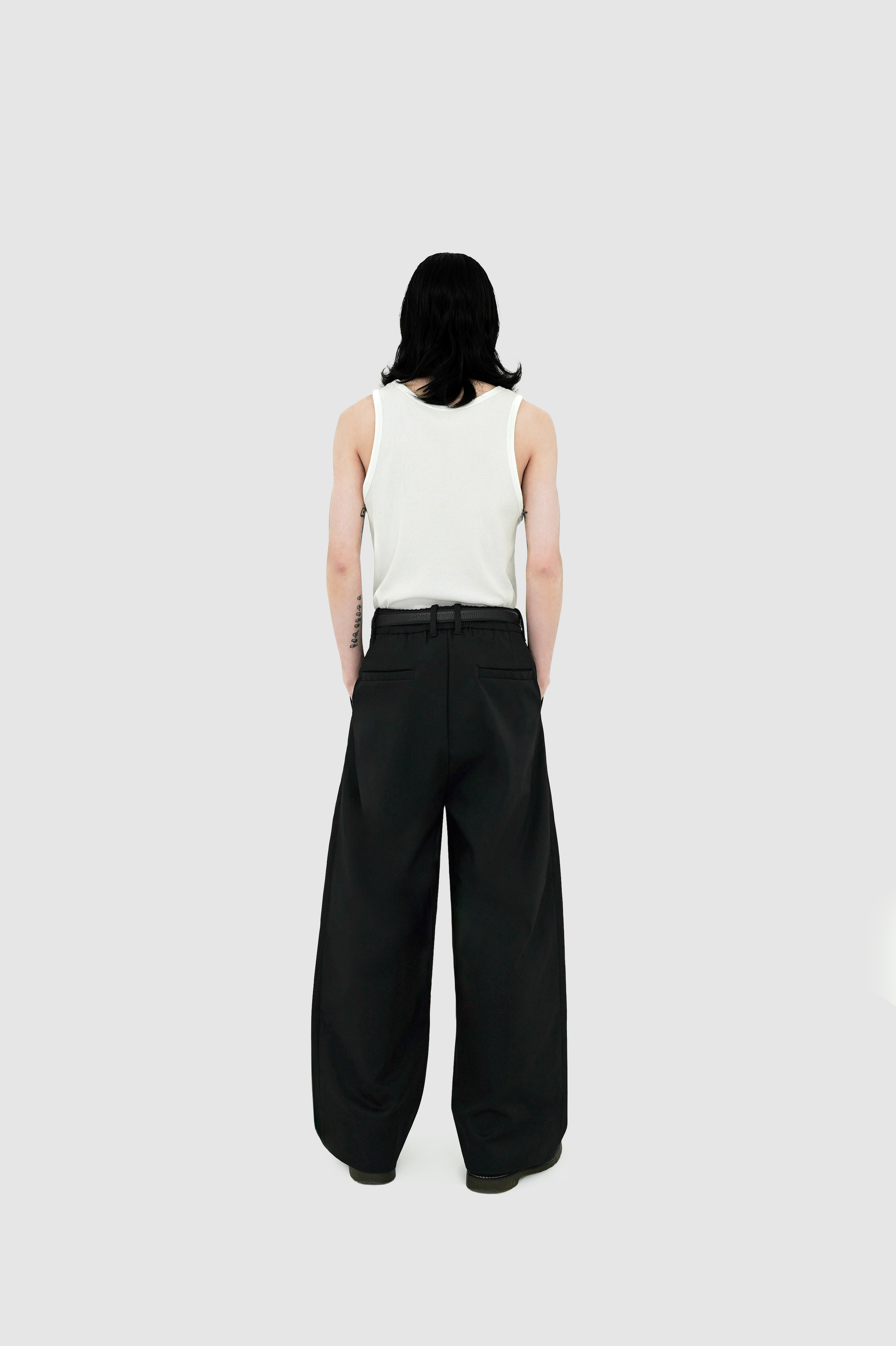 下半身にしっかりとボリュームを持たせつつ、だらしなく見えない大人向けワイドシルエット。緩やかなカーブと足元のわずかなテーパードにより、ワイドでも立体感とスッキリ感を両立。Aラインを簡単に構築できるかつ脚長効果もあるワイドパンツ。